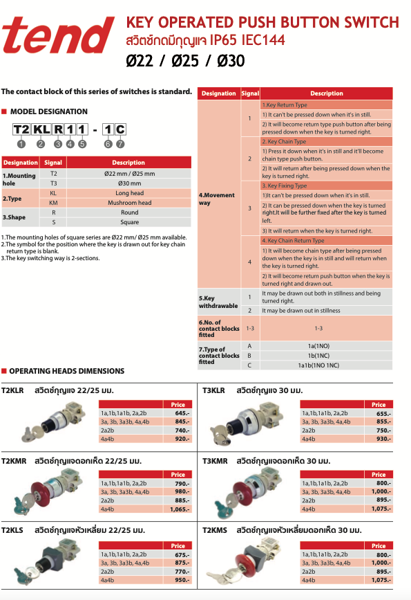 tend สวิตช์กดมีกุญแจ IP65 IEC144